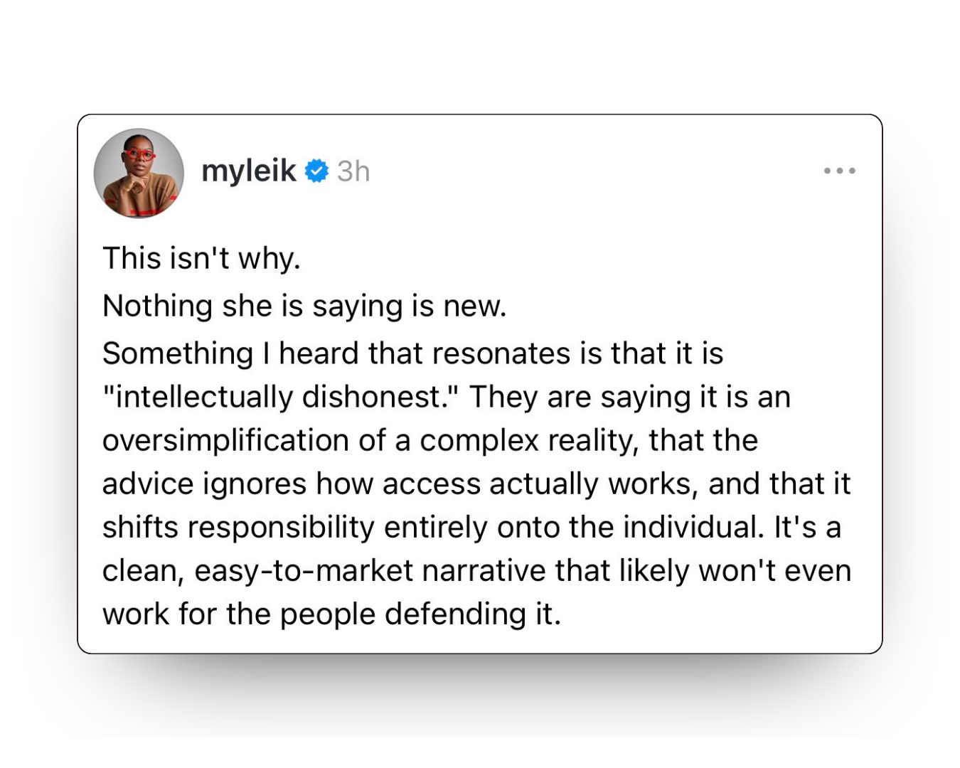 Take the recent discourse around Emma Grede as an example. A common thread in the criticism is that her messaging oversimplifies a complex reality and places too much responsibility on the individual. While that perspective is valid, there’s also a tension embedded within it. By focusing so heavily on what she should be saying—how she should contextualize her ideas and what she’s responsible for including—we end up placing the burden of systemic explanation onto a single individual.